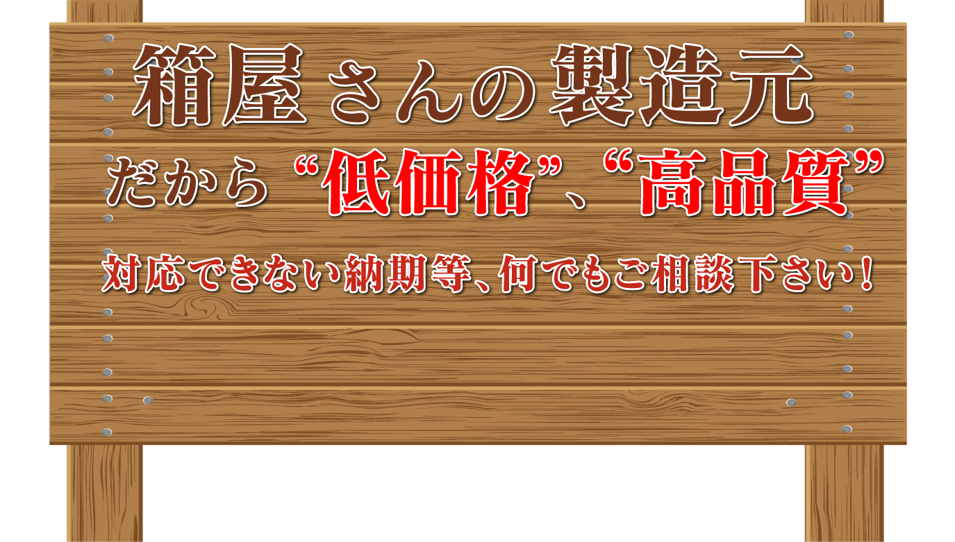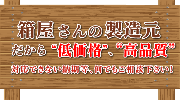 ひとつひとつ丁寧に手作りしているので、 品質に自信あり! 大手企業様からも ご愛顧いただいております! オリジナルの木箱なのに、 驚きの低価格! ぜひ一度お問い合わせください。 数量が多くても、短納期! 他社様でお断りされたお客様からも お受けしております。 ご相談ください。
